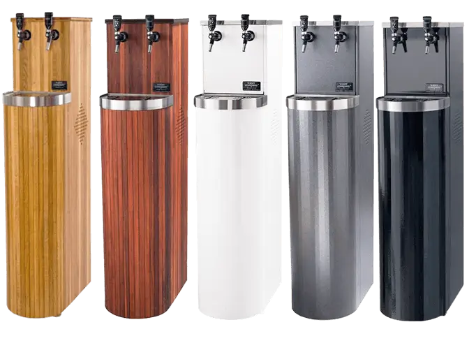 Tower fås både med kabinet i smukke træsorter af genbrugstræ fra en gulvfabrikant og i metalbeklædning i forskellige farver. Det gør den til en bæredygtig og stilfuld vandautomat, der passer ind på ethvert kontor, klinik eller fællesområde.