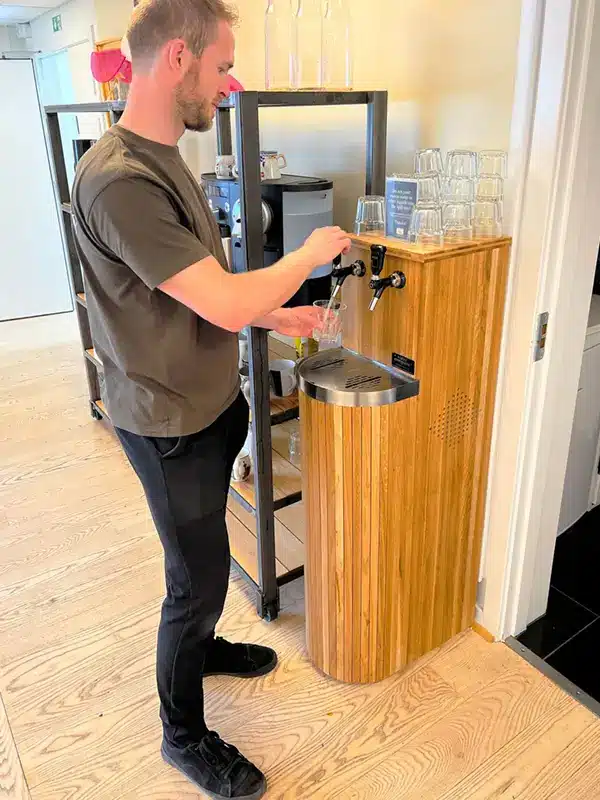 Ja, en vandkøler reducerer både plastik- og CO₂-forbrug markant, fordi vandet tappes direkte fra hanen i stedet for at blive transporteret på flasker. Vores Tower-model er endda produceret i genbrugstræ og er klimaneutral.